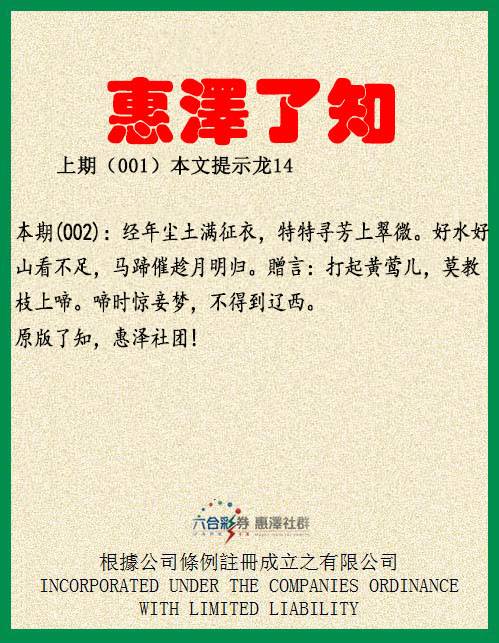 【惠泽了知】001期: 孤雁不饮啄,飞鸣声念群。谁怜一片影,相 失万重云?望尽似犹见,哀多如更闻。野鸦无意绪,鸣 噪自纷纷。 贈言:相去日已远,衣带日已缓。浮云蔽白 日,游子不顾反 。 【惠泽六肖】:虎猪鼠羊牛龙 【惠泽三肖】:虎猪鼠 【惠泽一肖】: 虎 【惠泽特码】:04.28.19.31.30.42.11.35.29.41.02.26 【惠泽平肖】:羊羊羊 【惠泽平尾】:000 |